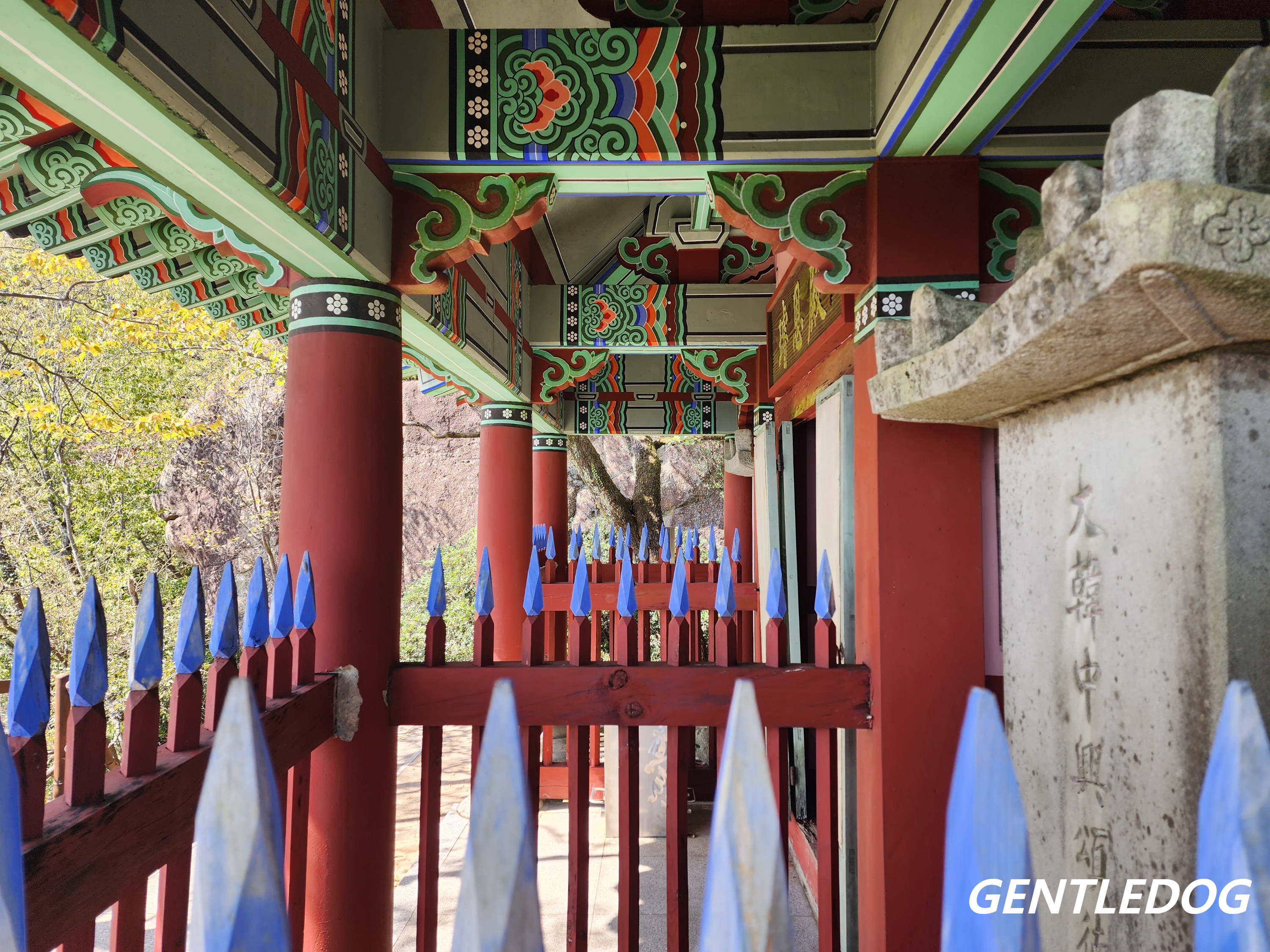 선은전은 사찰과는 다른 왕실의 단청으로 되어 있고, 안에는 비석과 가마등이 있습니다.