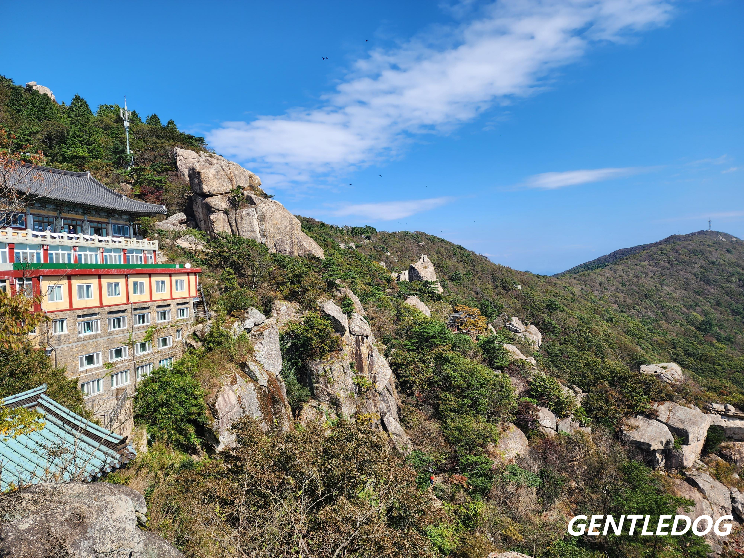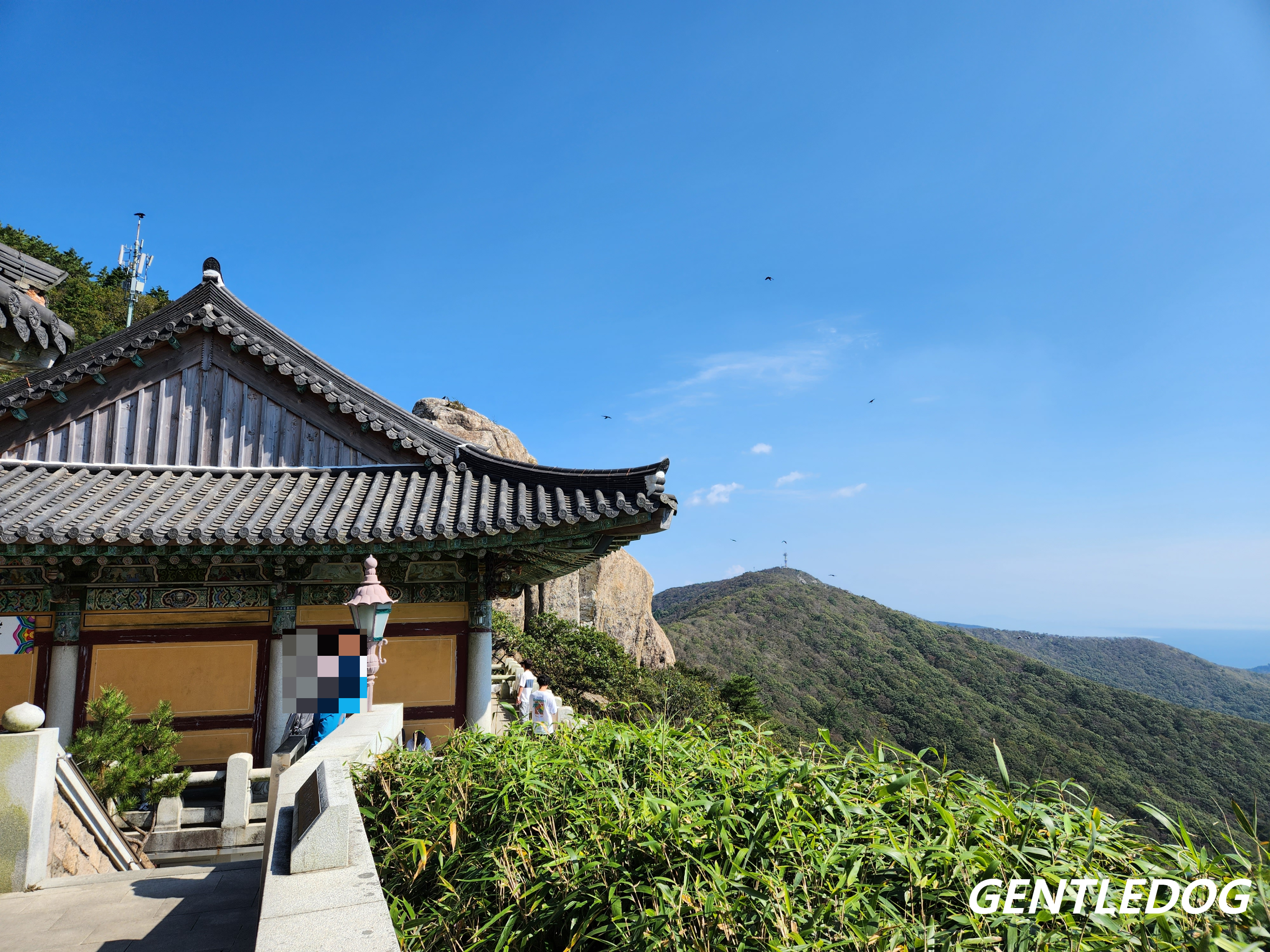 보리암 입구에 들어서면, 간성각 종무소와 극락전 사이로 멀리 보이는 남해와 산 능선, 높은 하늘이 인상적입니다.
