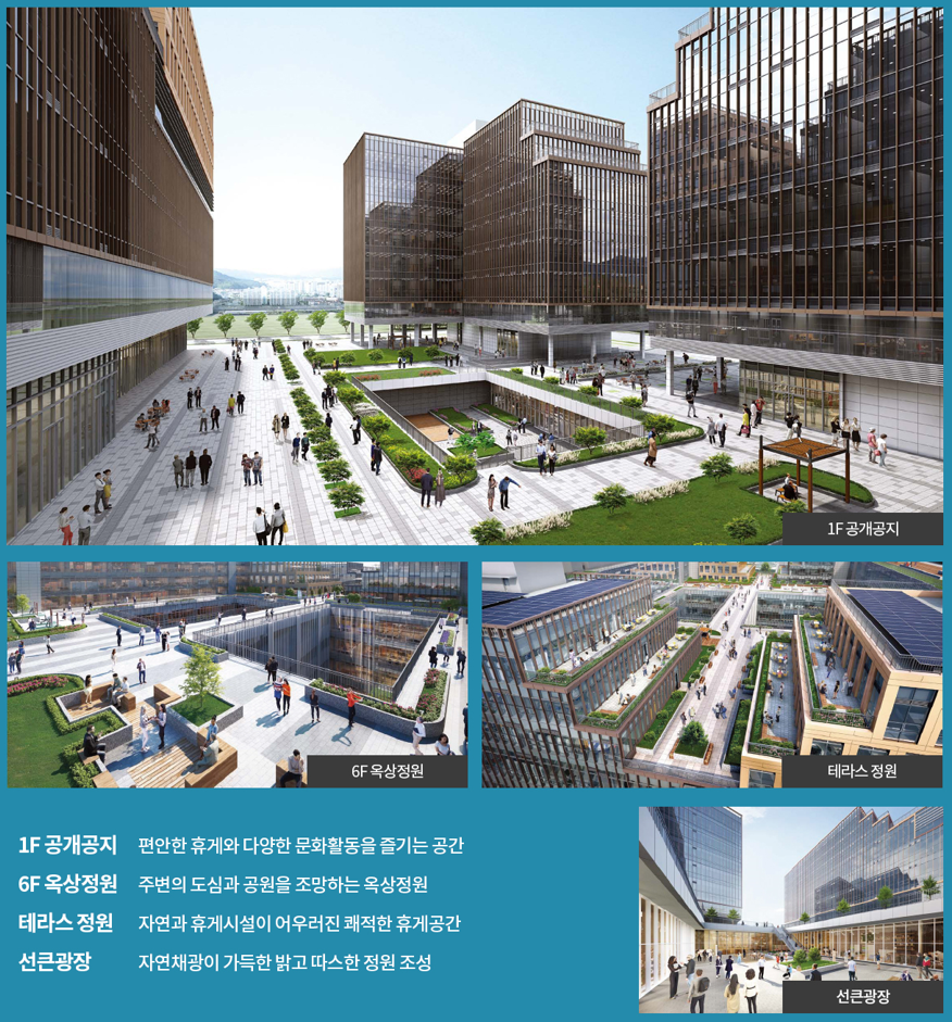 3) 옥상정원과 선큰가든, 각종 커뮤니티(샤워실 미팅실 휴게실 체력단련실 등) 제공으로