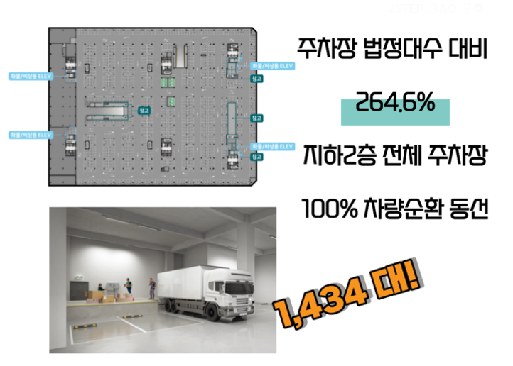 지하 2층 ~ 지상 8층 으로 구성되어 있으며, 주차대수 1,434대로 법정대수의 264.6% 입니다.