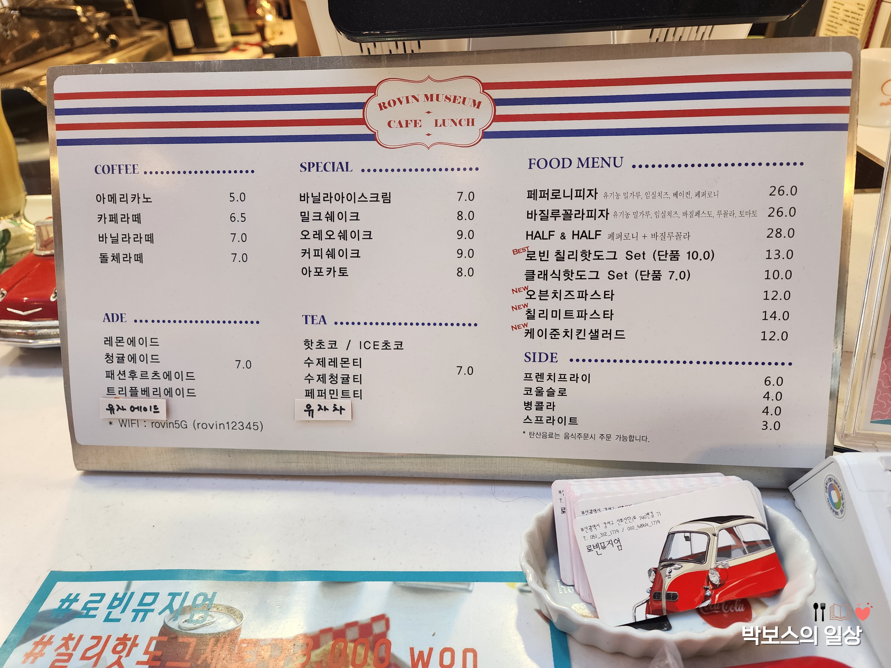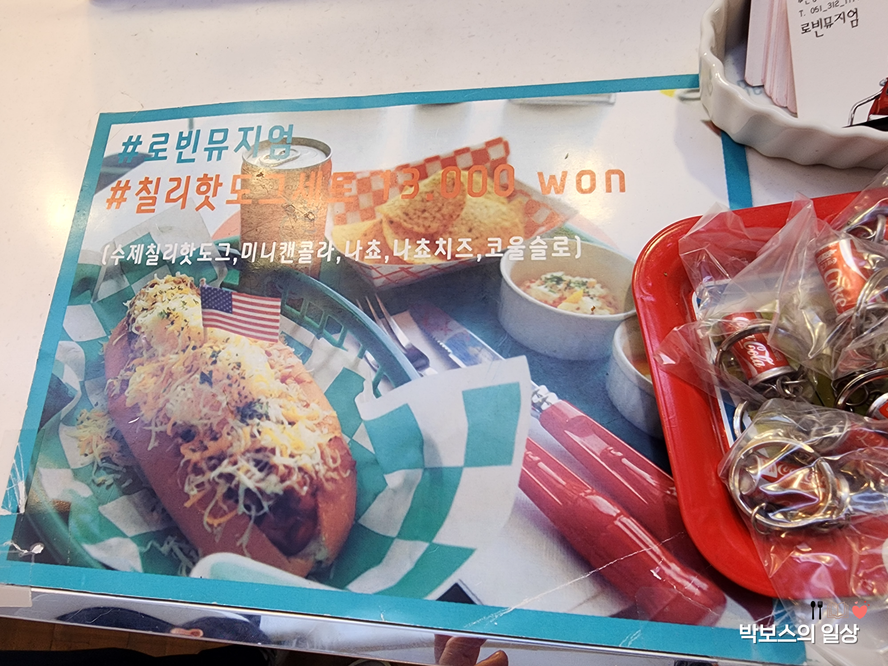 메뉴는 커피와 각종 음료, 아이스크림과 쉐이크도 있습니다. 메인 요리는 피자와 핫도그, 파스타가 메인입니다. 메뉴조차 뭔가 장소와 찰떡이라는 느낌이네요. 피자는 다른 곳에서도 자주 접했는데 핫도그는 잘 접하지 못한 것 같았습니다. 그래서 로빈뮤지엄 칠리 핫도그 세트를 먹어보기로 했어요!