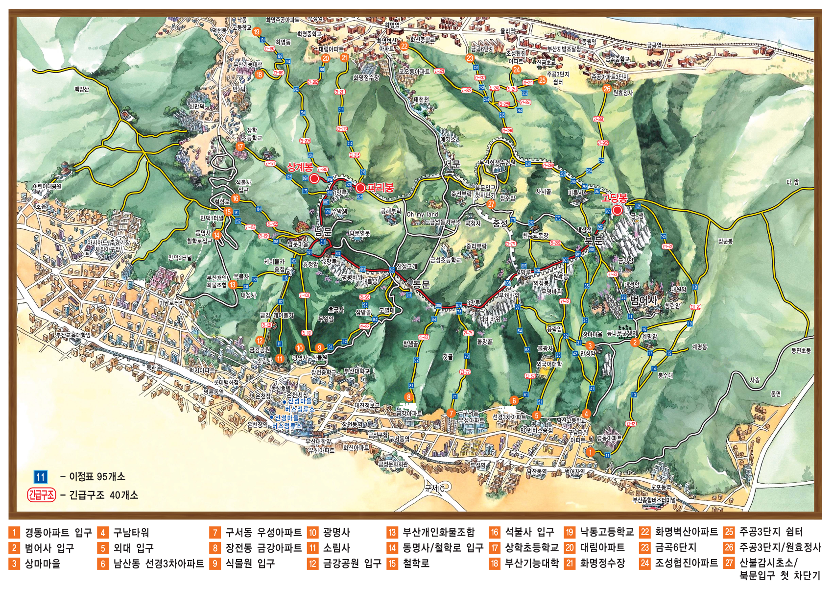 27. 금정산 제27 등산로 부산교육원 앞 북문 1차 단지 ~ 북문 2,400m 226m 40분