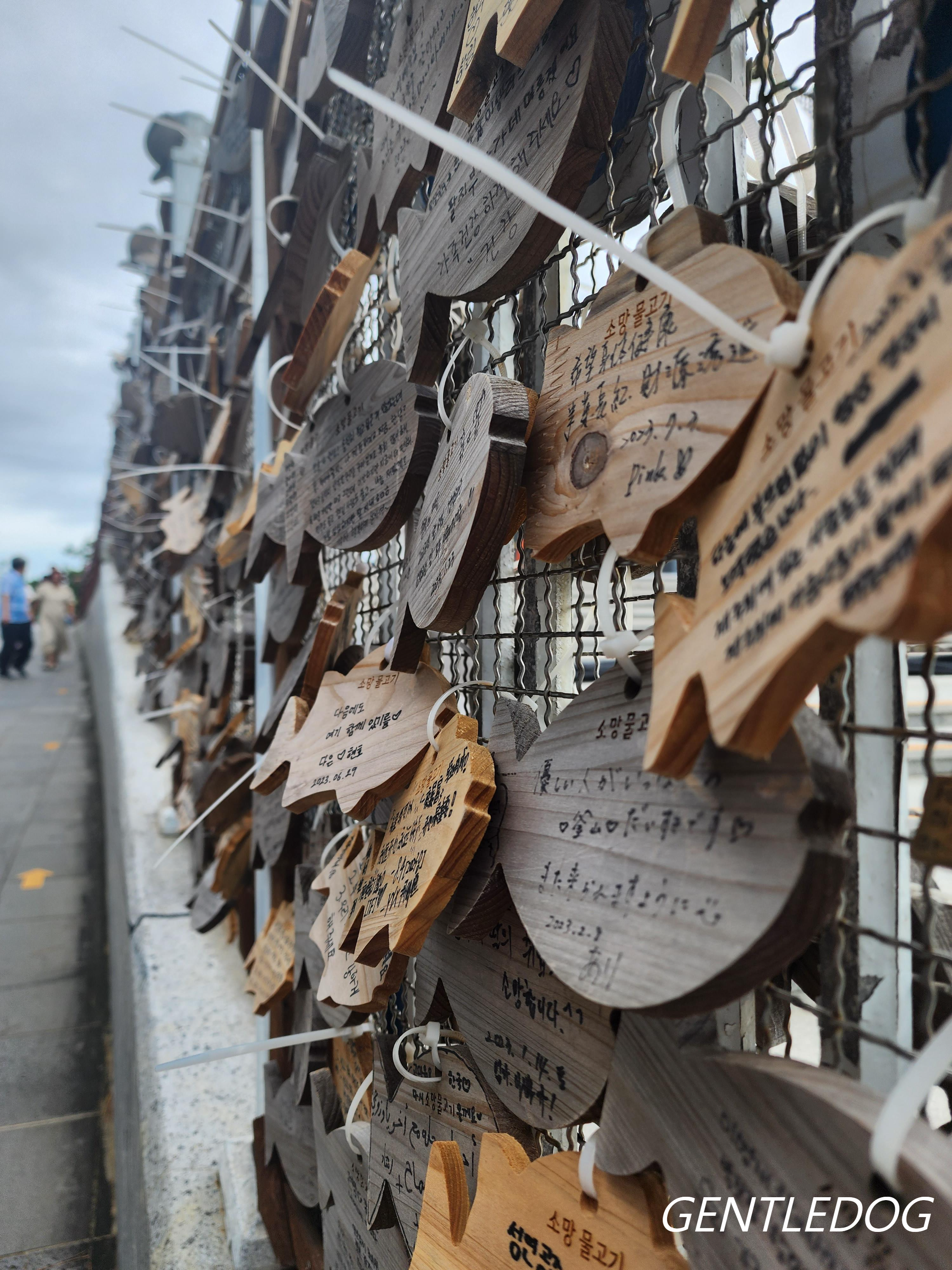 물고기모양 목판에 소원을 적어 많이 걸어두었더군요!