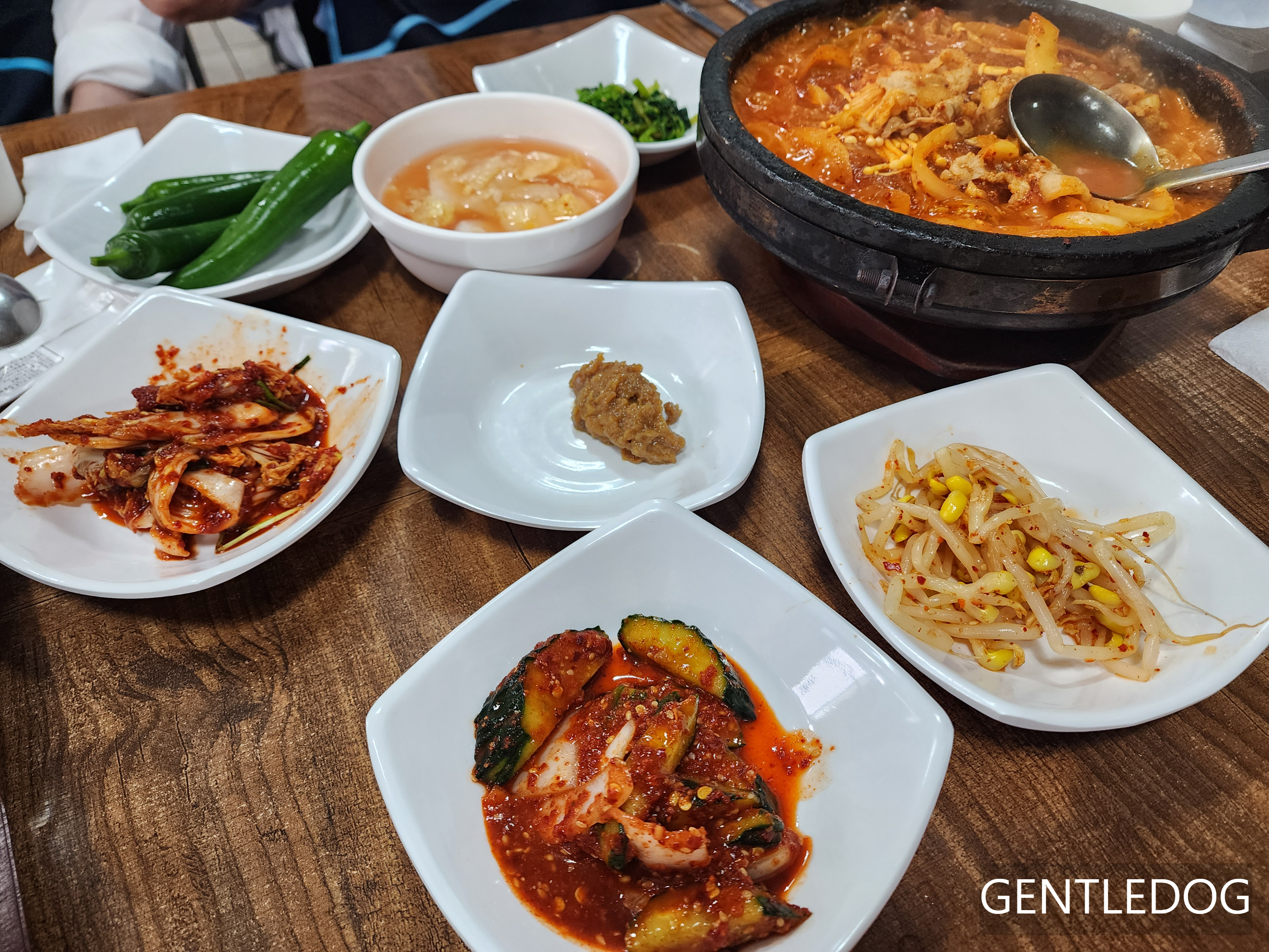 밑반찬은 아삭고추와 콩나물, 동치미국물과 김치 미나리 등이 나왔는데, 오이랑 고추가 맛있어서 몇 번이고 더 달라고 했네요!