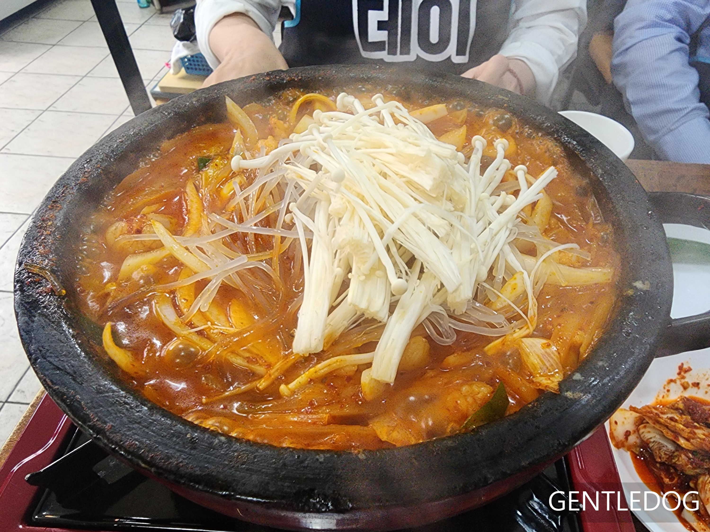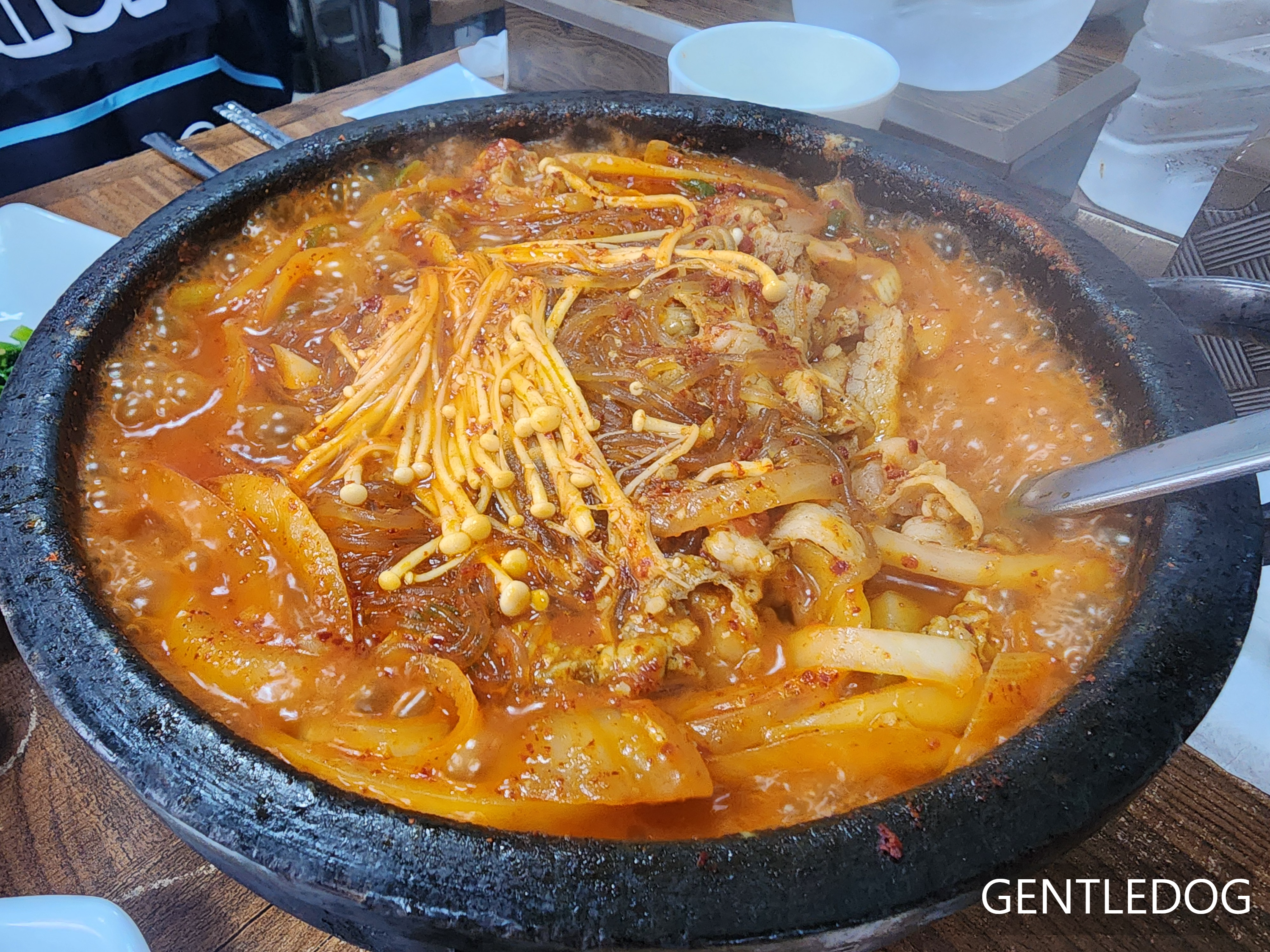 넓은 뚝배기 같은 그릇에 나옵니다. 안에 양파도 많고 버섯도 가득, 특히 당면이랑 고기가 참 맛있습니다.