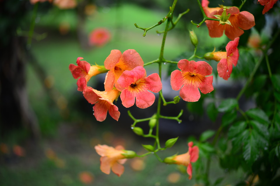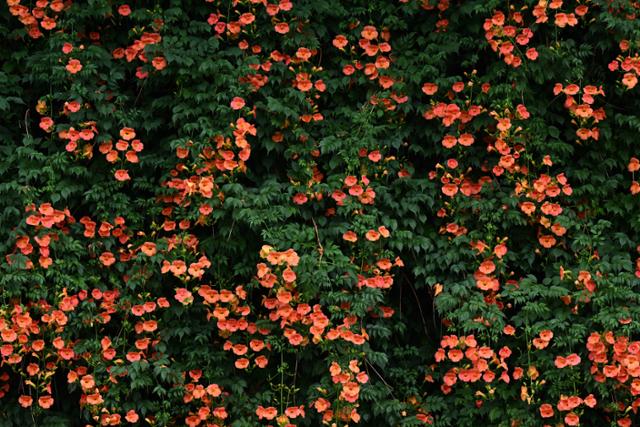 - 꽃: 능소화의 꽃은 종 모양으로, 주로 주황색에서 붉은색까지 다양한 색조를 띱니다. 개화 시기에는 가지 끝에 큰 꽃들이 모여서 피어나며, 각각의 꽃은 지름이 6~8cm에 달합니다. 꽃은 주로 하늘을 향해 피며, 꽃받침은 5갈래로 갈라져 있습니다.
