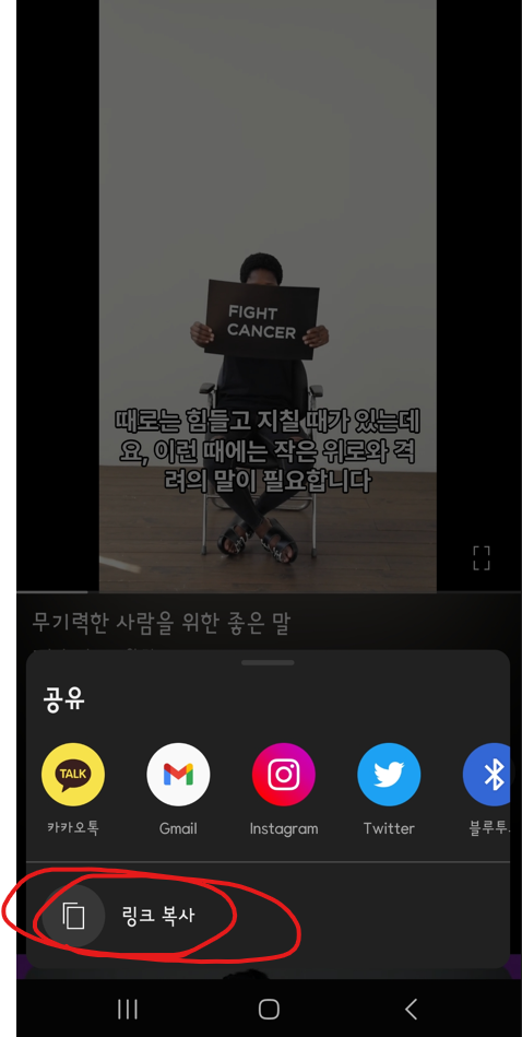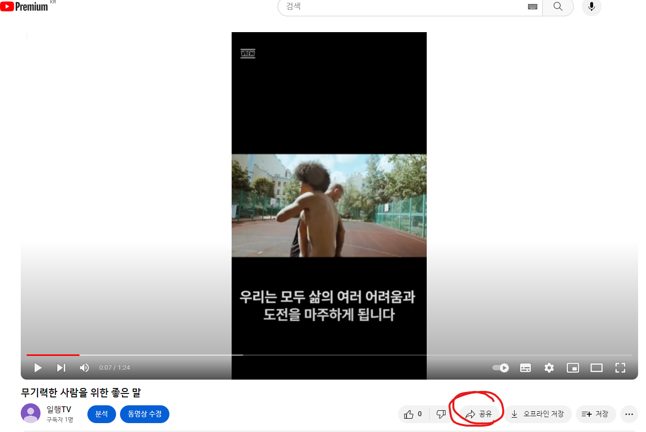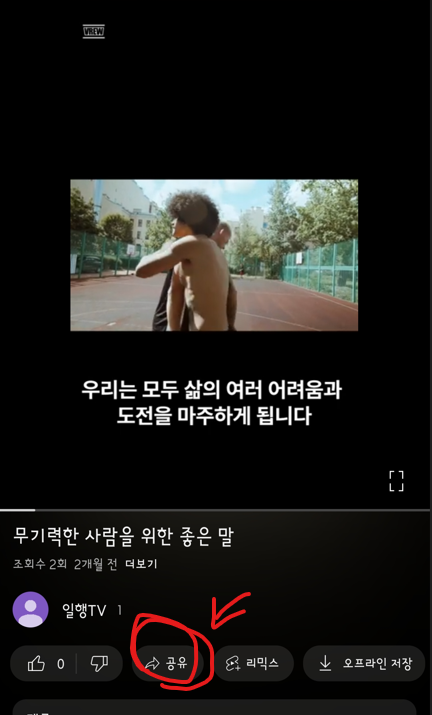 모바일 유튜브 영상에 공유를 클릭하고 링크를 복사합니다.