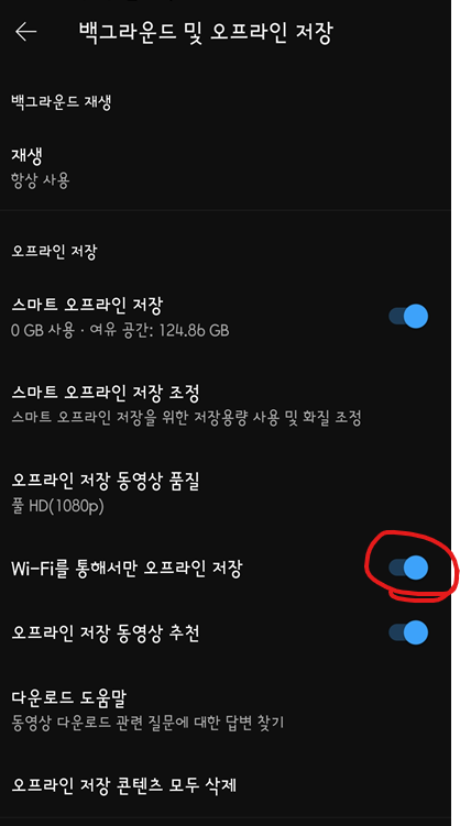 그런데 저장이 안 되었다고 하면, 설정에 들어가셔서 Wi-Fi를 통해서만 오프라인 저장이 켜져 있는지 확인하세요.